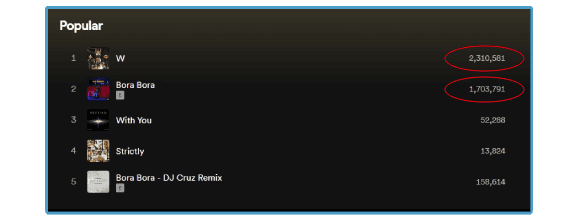 He has over 120,000 active listeners on Spotify with popular tracks 'W' and 'Bora Bora' which have a total of over 4 Million streams combined since their release!
